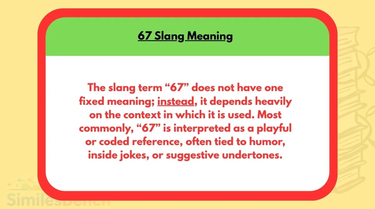 The slang term “67” does not have one fixed meaning; instead, it depends heavily on the context in which it is used. Most commonly, “67” is interpreted as a playful or coded reference, often tied to humor, inside jokes, or suggestive undertones. In some online circles, it may be used as a variation of numeric slang similar to other numbers that hint at meanings indirectly.